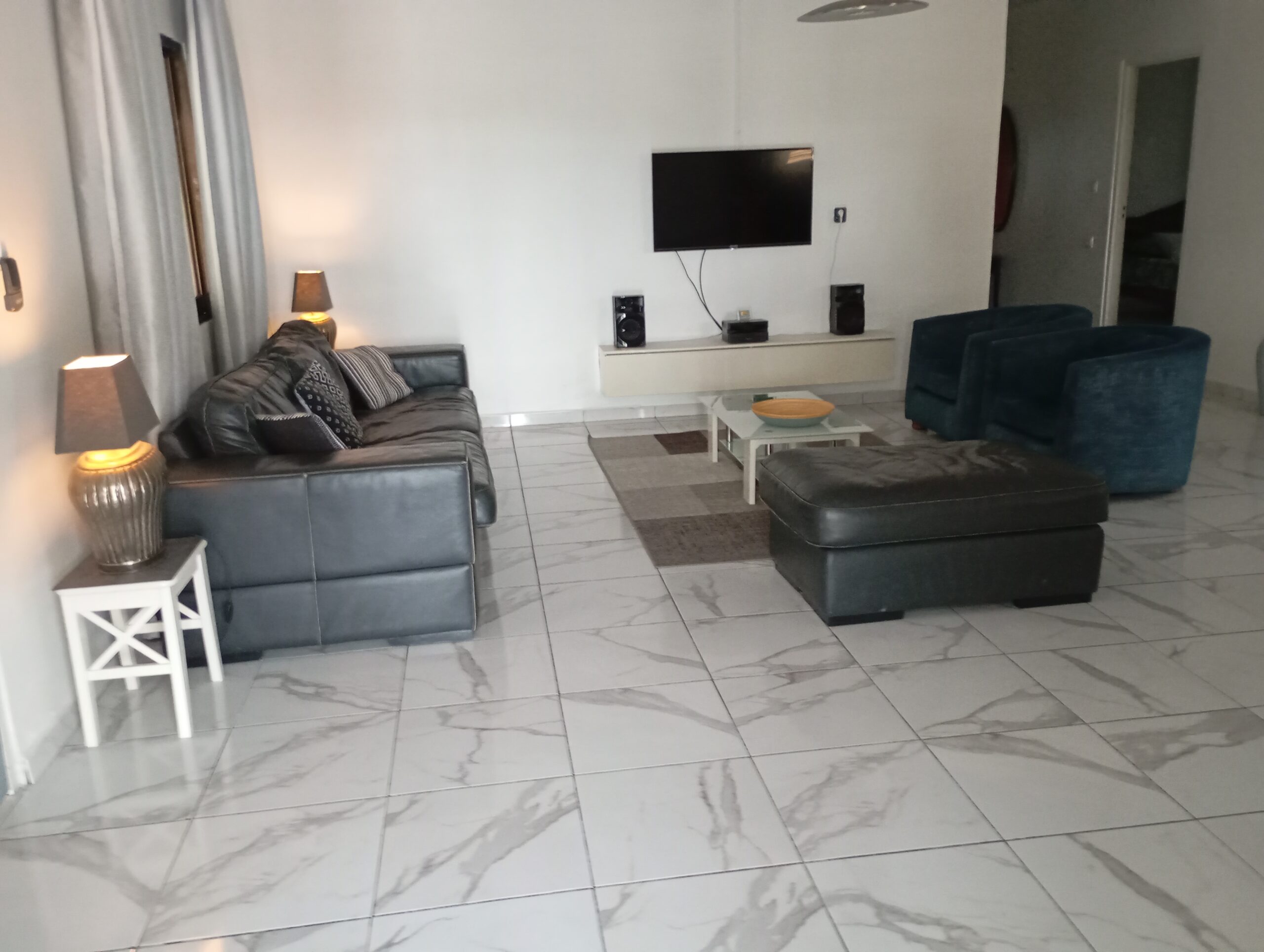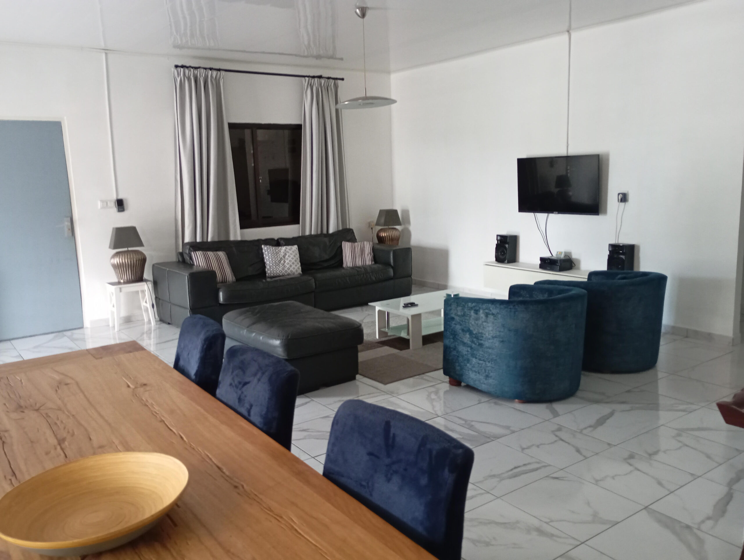 Layout house; front terrace, kitchen, spacious living room, 3 bedrooms, bath, toilet, garage.The house has a spacious living room with a modern open kitchen, 3 bedrooms, all rooms have air conditioning. The house has a separate bath / toilet, spacious parking garage for a car, outside accommodation with terrace set. Everything secured with thieves iron and cameras.